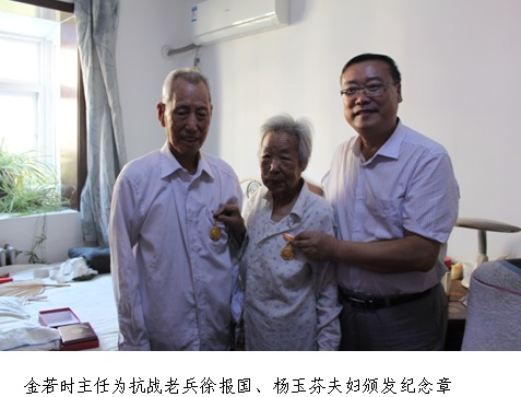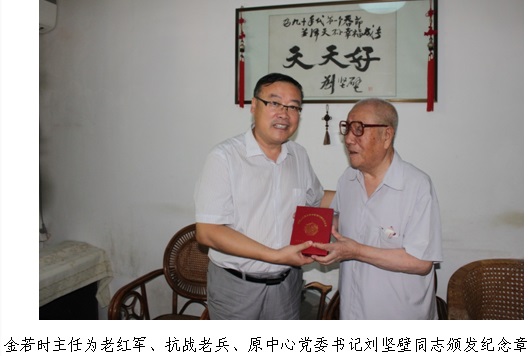在纪念中国人民抗日战争胜利70周年活动期间,中国地质调查局天津地质调查中心主任金若时带领相关部门负责同志,对9名抗战老兵进行慰问,将中共中央、国务院、中央军委颁发的抗战纪念章送到他们手上,为抗战老兵送去了慰问金和慰问品,向他们表达最崇高的敬意和诚挚的问候。