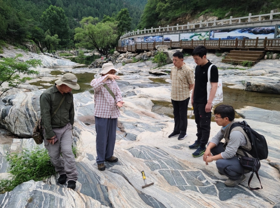 考察组一行考察了彩石溪一带斜长角闪岩、TTG片麻岩,傲徕山二长花岗岩,红门桶状构造辉绿岩墙以及泰山周边的泰山岩群变质枕状玄武岩。围绕泰山早前寒武纪古老地壳形成与演化、新太古代构造体制、变质岩区区调技术方法等问题进行了深入研讨。金巍教授针对地质科研、地质教学向地质科普转化,地质遗迹开发与保护等提出了宝贵建议。